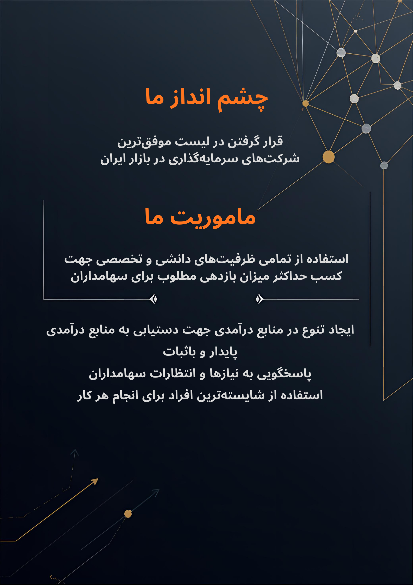 ما تلاش می کنیم از طریق شناسایی سه ارزش الهام بخش خود و تعریف و جاری سازی کدهای رفتاری متناسب با آنها در سطح رفتارهای روزانه و سیاستهای کسب و کاری خود، رضایت مشتریان مان را افزایش داده، درآمدی پایدار و پاک پدید آوریم تا با عنایات الهی به عنوانی شرکتی اخلاق مدار با فرهنگی قوی و همراستا با استراتژیهای سازمان سرآمد باشیم.